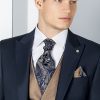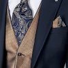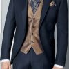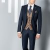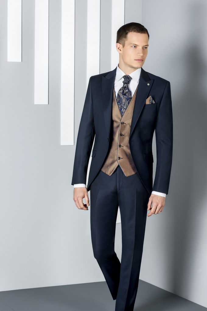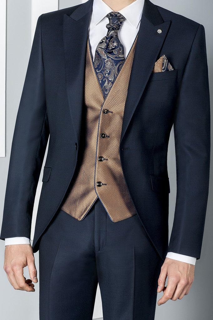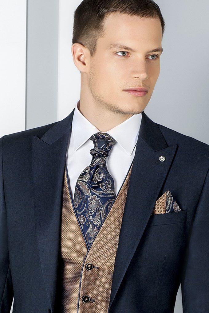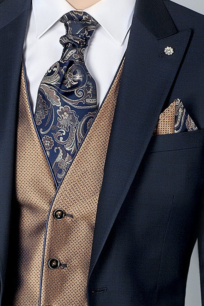Traje azul cuadros en tejido lana. Americana con solapa de pico y 1 botón juega en constraste con chaleco de 4 botones, corbatón y pañuelo.