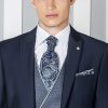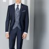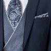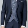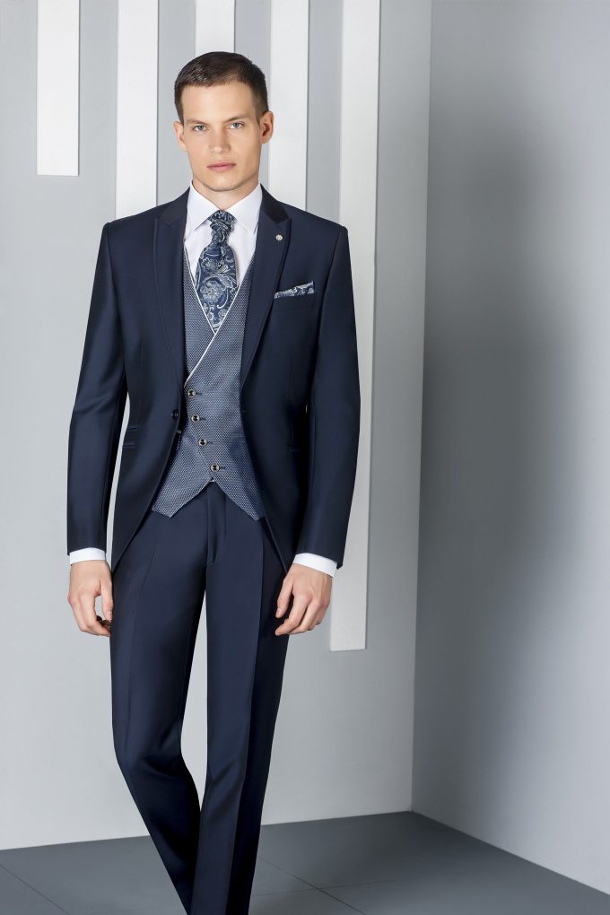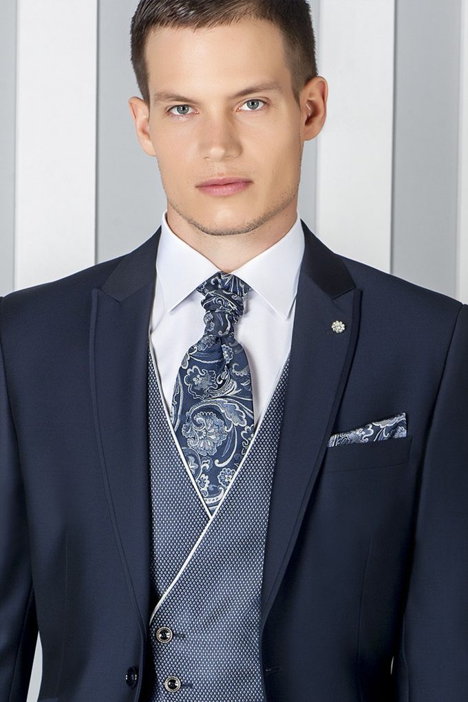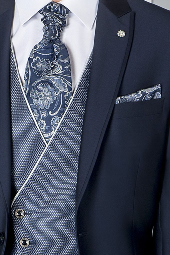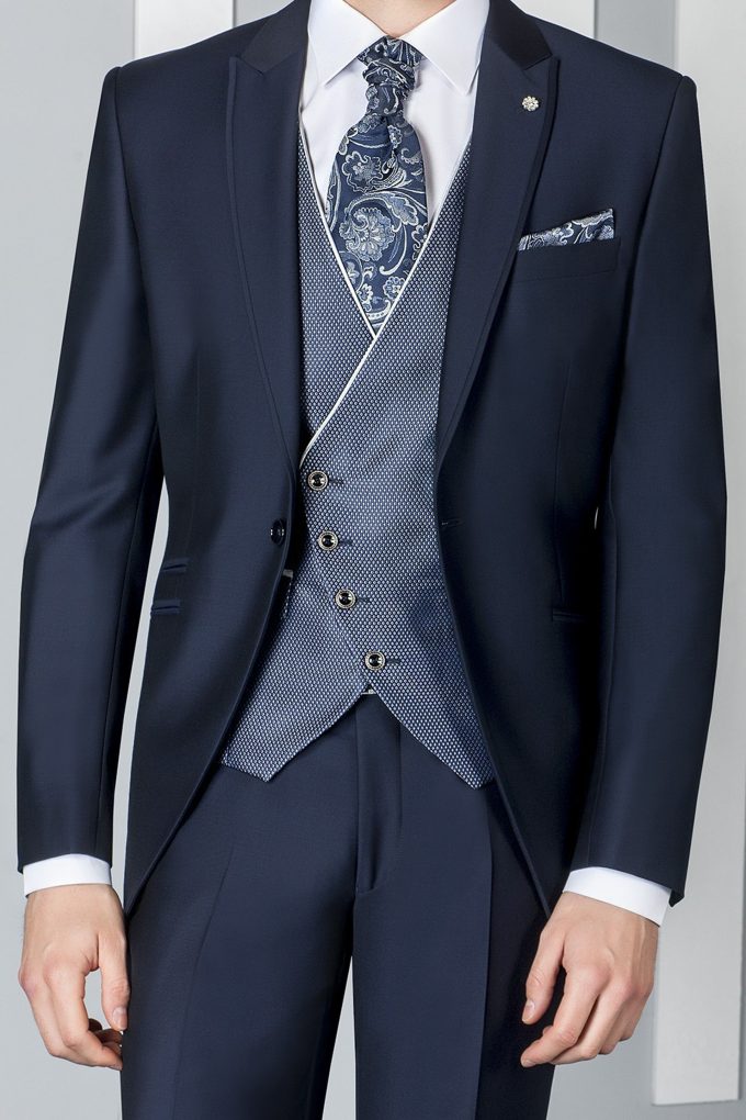 raje azul liso en tejido lana mohair. Americana con solapa de pico y 1 botón juega en constraste con chaleco cruzado de 4 botones, corbatón y pañuelo.