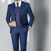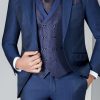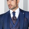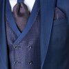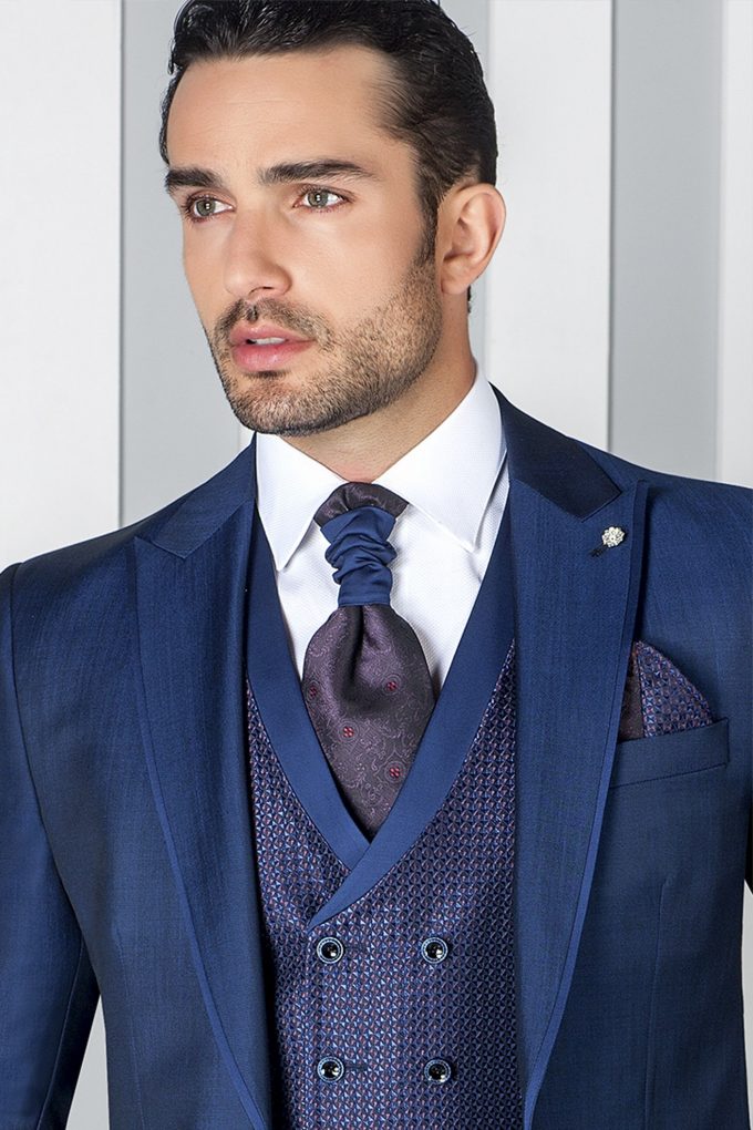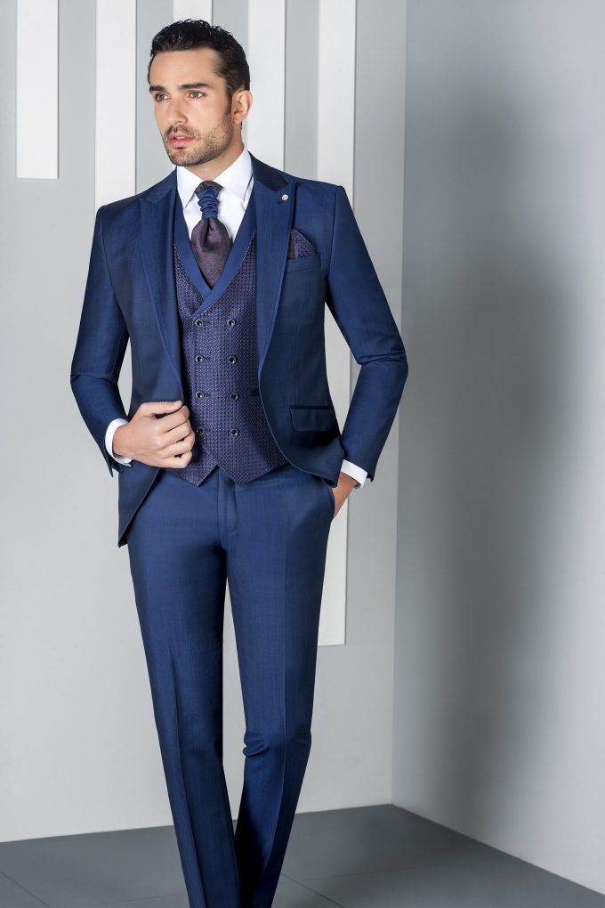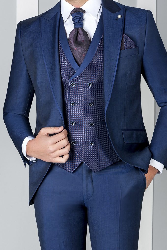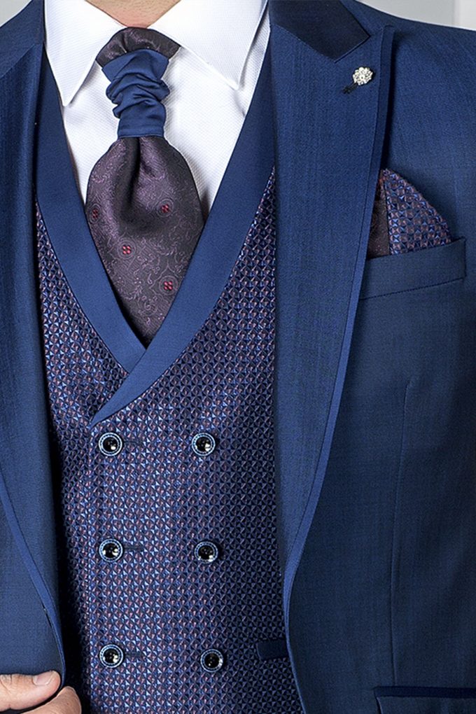 Traje azul liso en tejido lana mohair. Americana con solapa de pico y 1 botón juega en constraste con chaleco cruzado y 4×4 botones, corbatón y pañuelo.