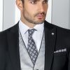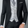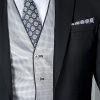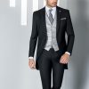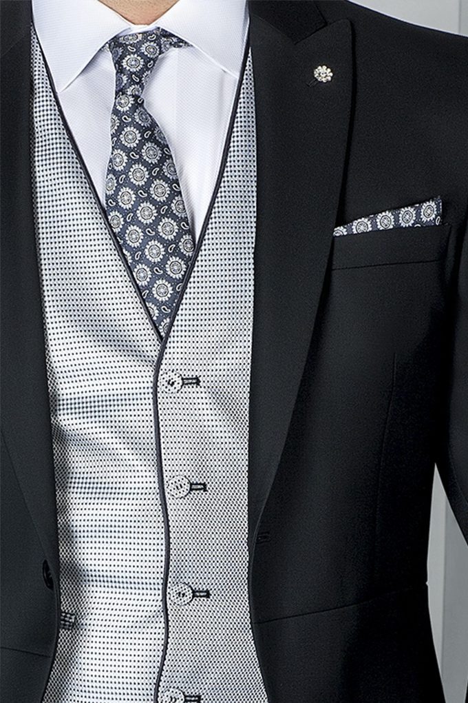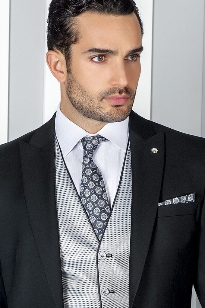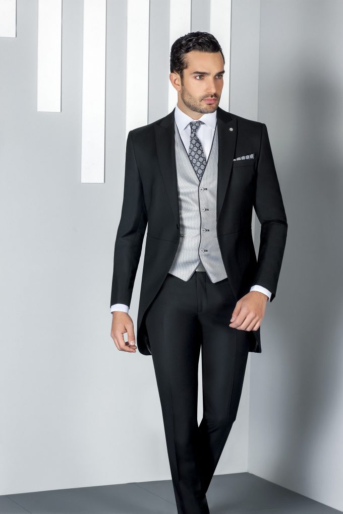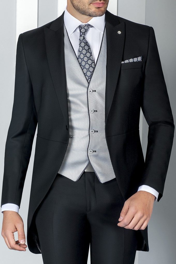 Traje chaque negro liso en tejido lana. Americana con solapa de pico y 1 botón juega en constraste con chaleco de 4 botones, corbata y pañuelo.
