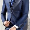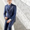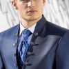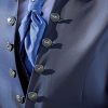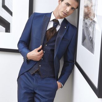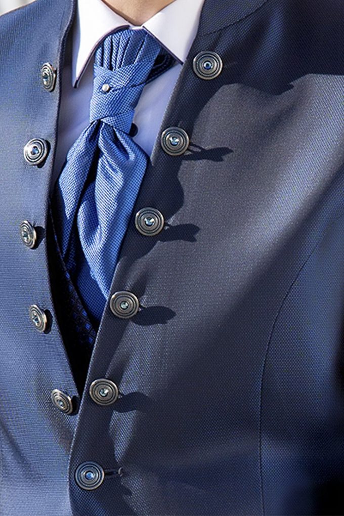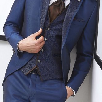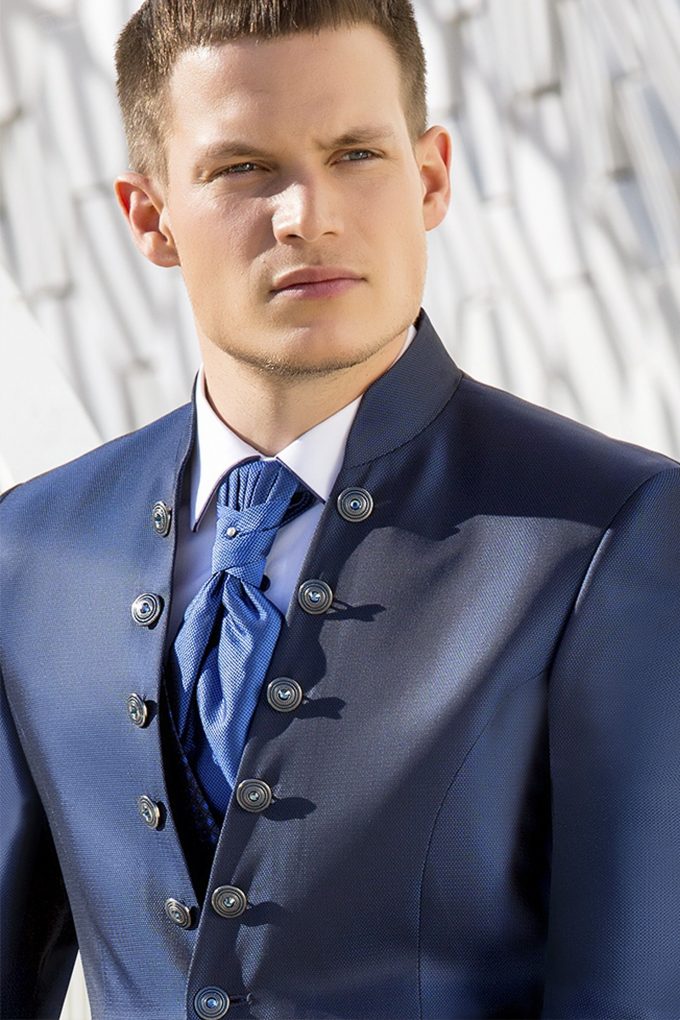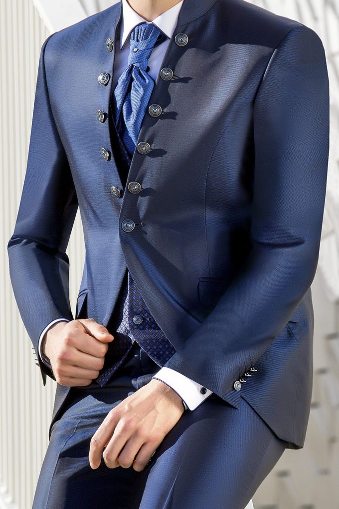 Traje azul microdibujo en tejido acetato lana. Americana con cuello mao y 1×5 botones va a juego con chaleco de 4 botones y corbatón.