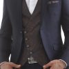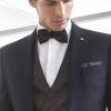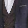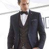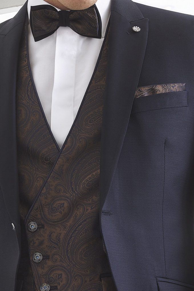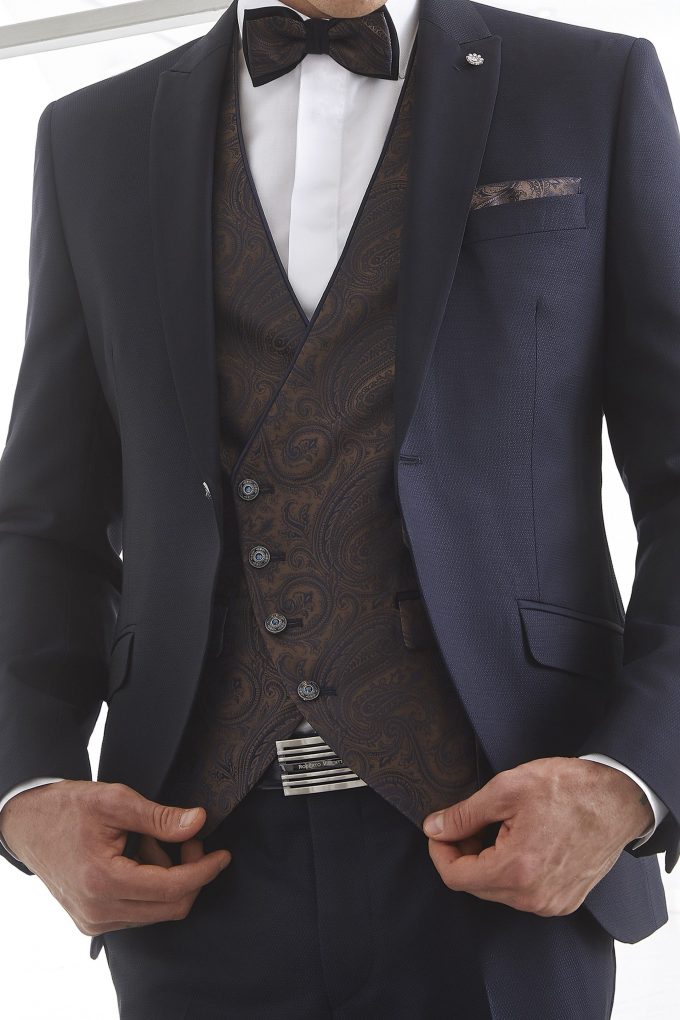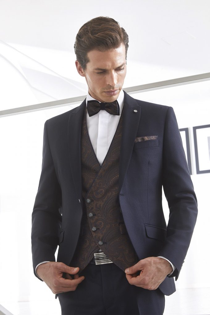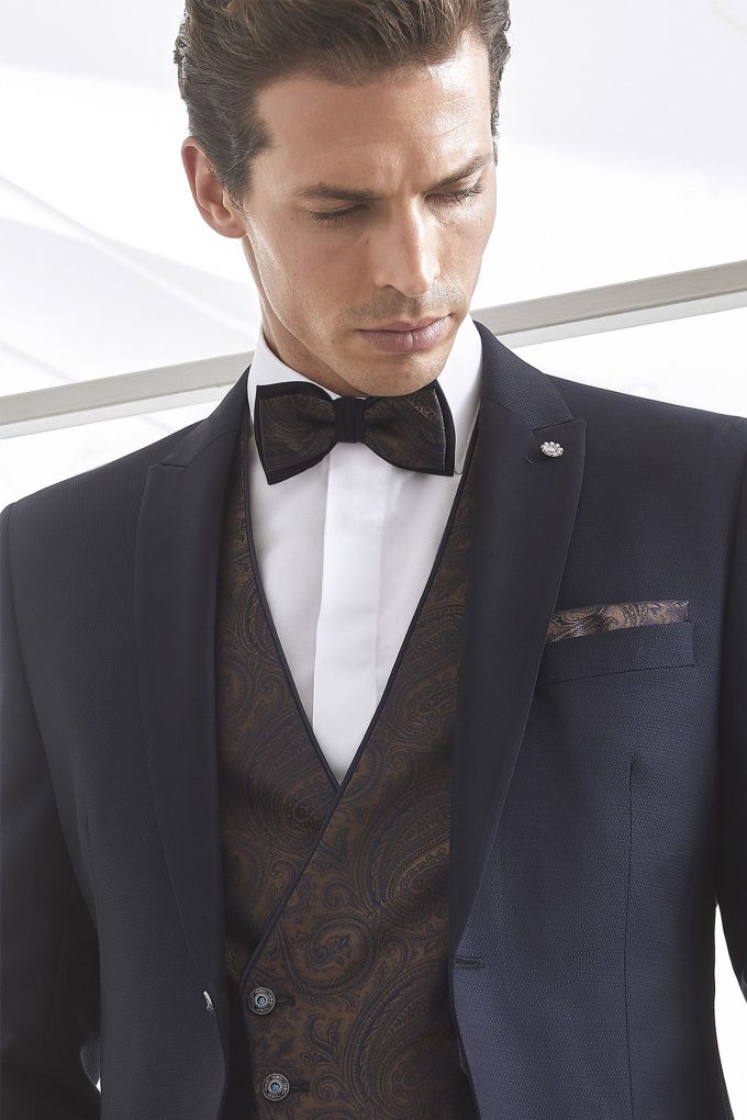 Traje azul microdibujo en tejido acetato lana. Americana con solapa de pico y 1 botón juega en constraste con chaleco cruzado de 4 botones, corbatón, pajarita y pañuelo.