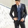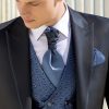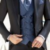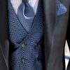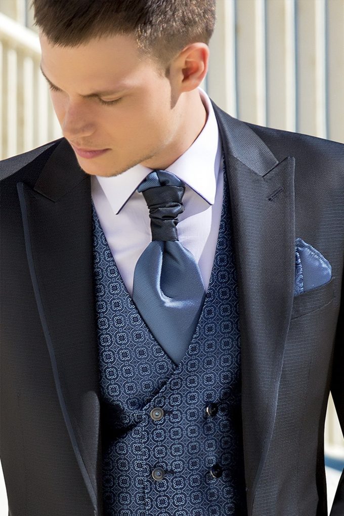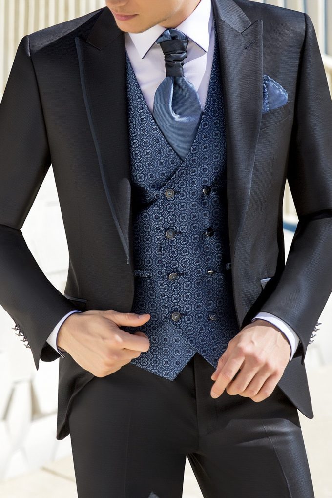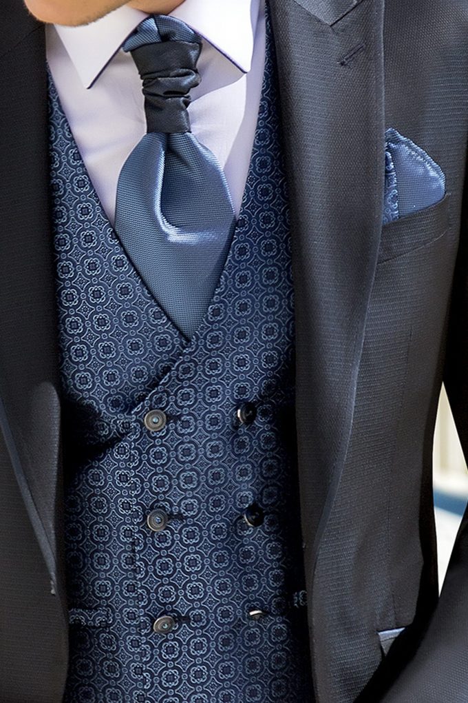 Traje azul microdibujo en tejido acetato lana. Americana con solapa de pico y 1 botón juega en constraste con chaleco cruzado 4×4 botones, corbatón y pañuelo.
