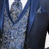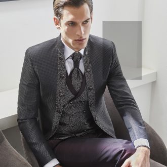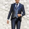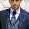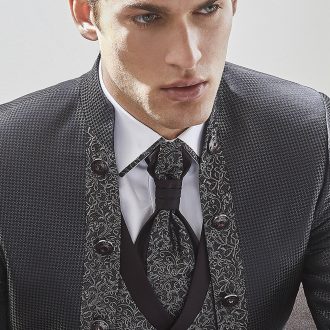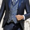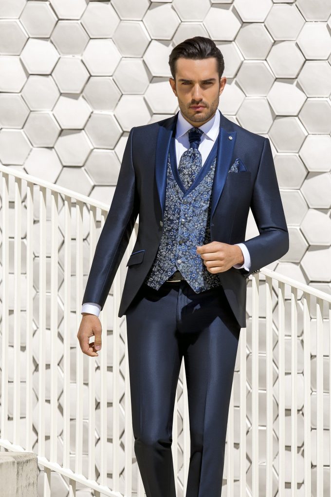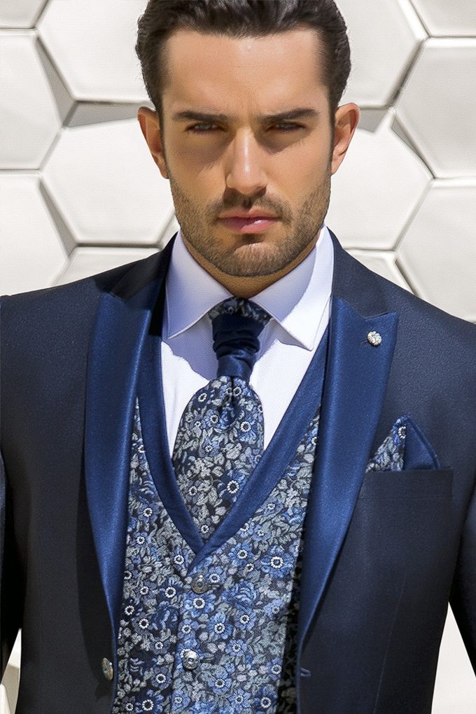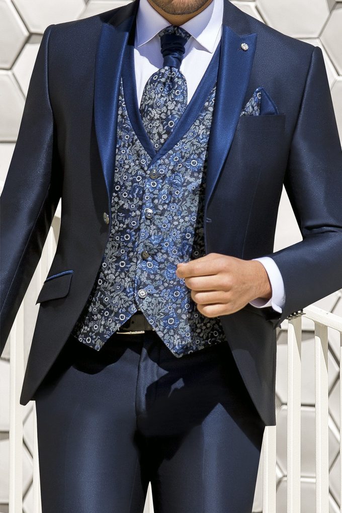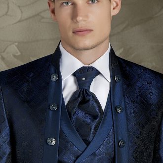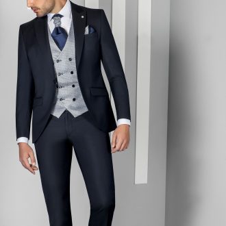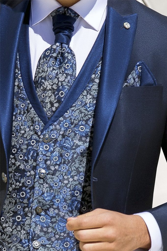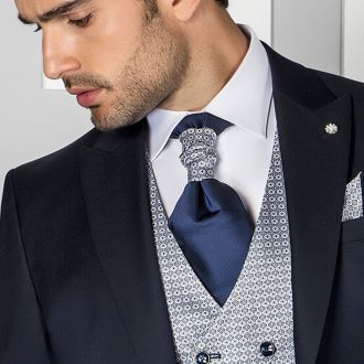 Traje azul microdibujo en tejido poliéster viscosa. Americana con solapa de pico y 1 botón juega en constraste con chaleco de 4 botones, corbatón y pañuelo.