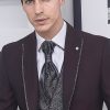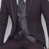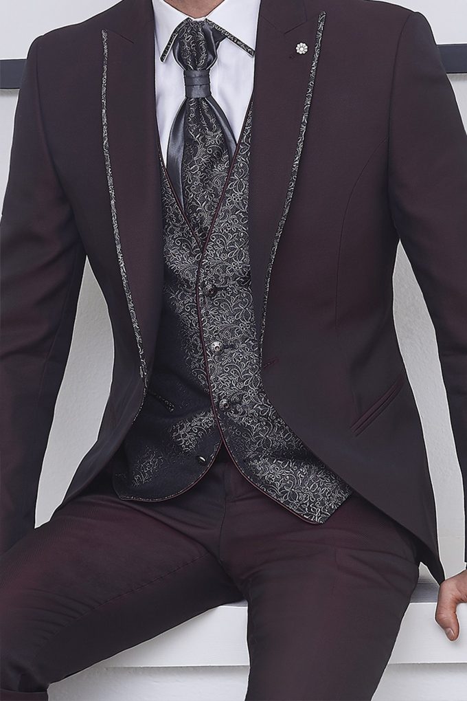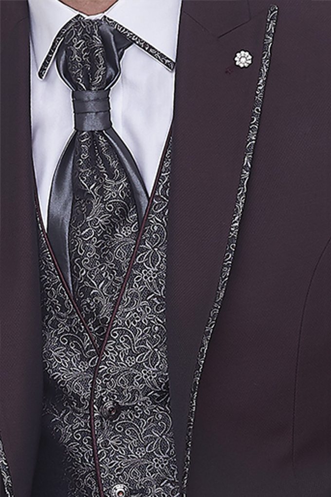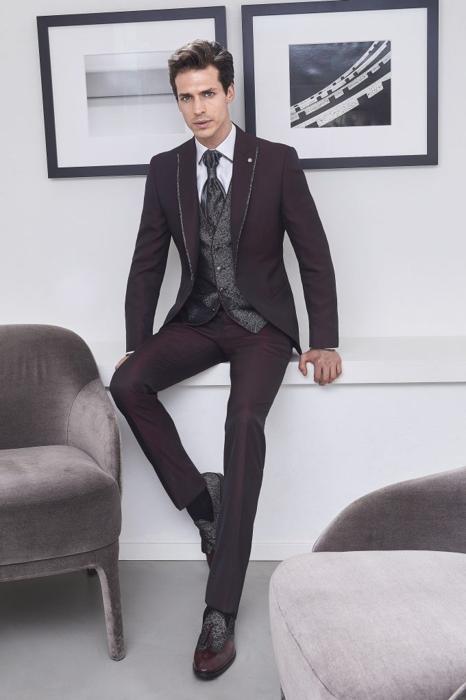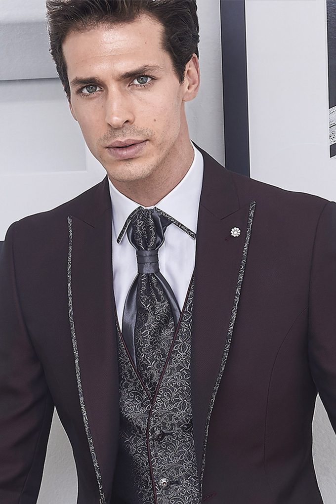 Traje burdéos microdibujo en tejido viscosa lana acetato. Americana con solapa de pico y 1 botón va a juego con chaleco de 4 botones y corbatón.